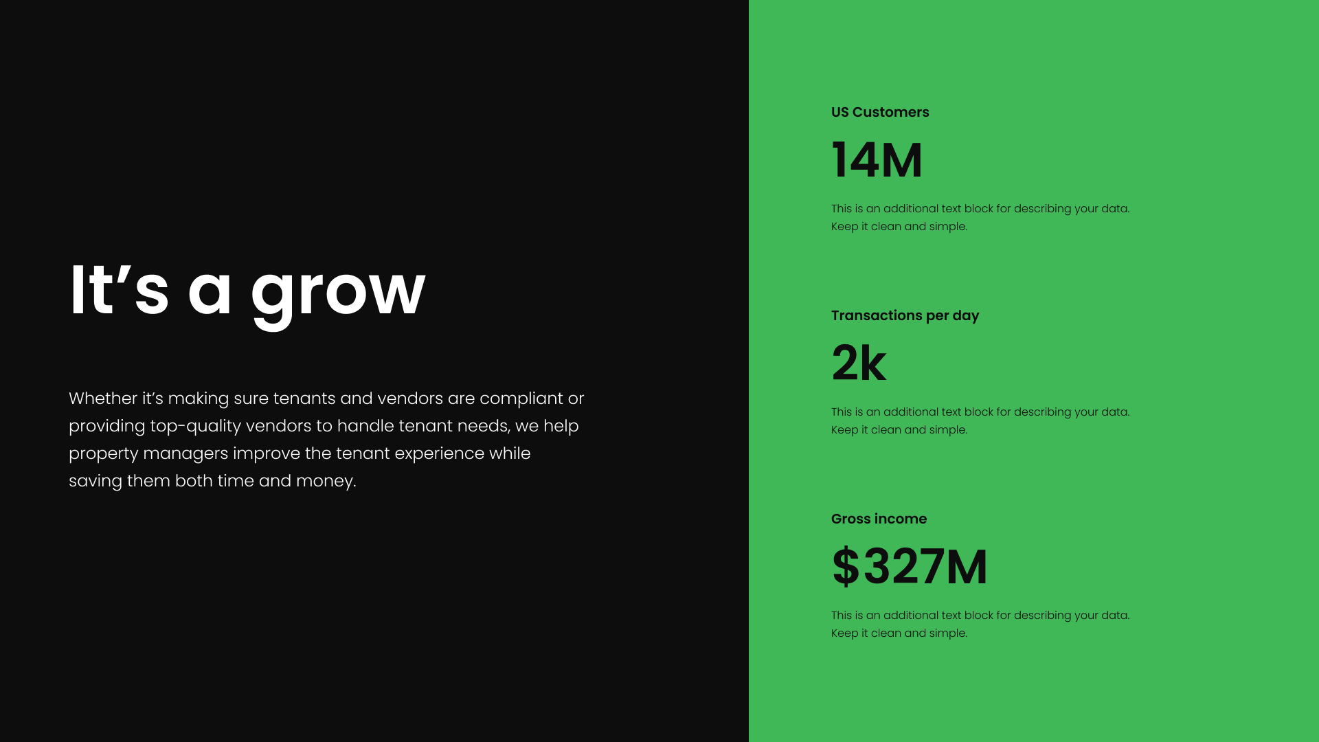This design features a clean, minimalist corporate style using high contrast and intentional color blocking to highlight key performance metrics. The visual language is professional, relying on large numbers and ample negative space to ensure data clarity and readability.