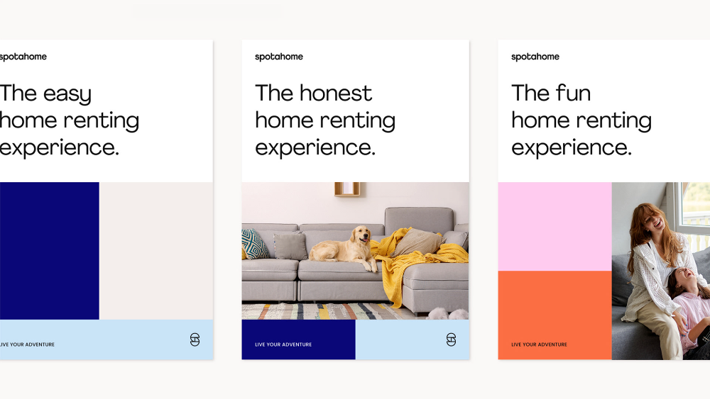 This visual set utilizes a modern, clean design language characterized by strong color blocking and lifestyle photography to convey trust and warmth. The composition is balanced, pairing clear text with evocative imagery to create an inviting and aspirational user experience.