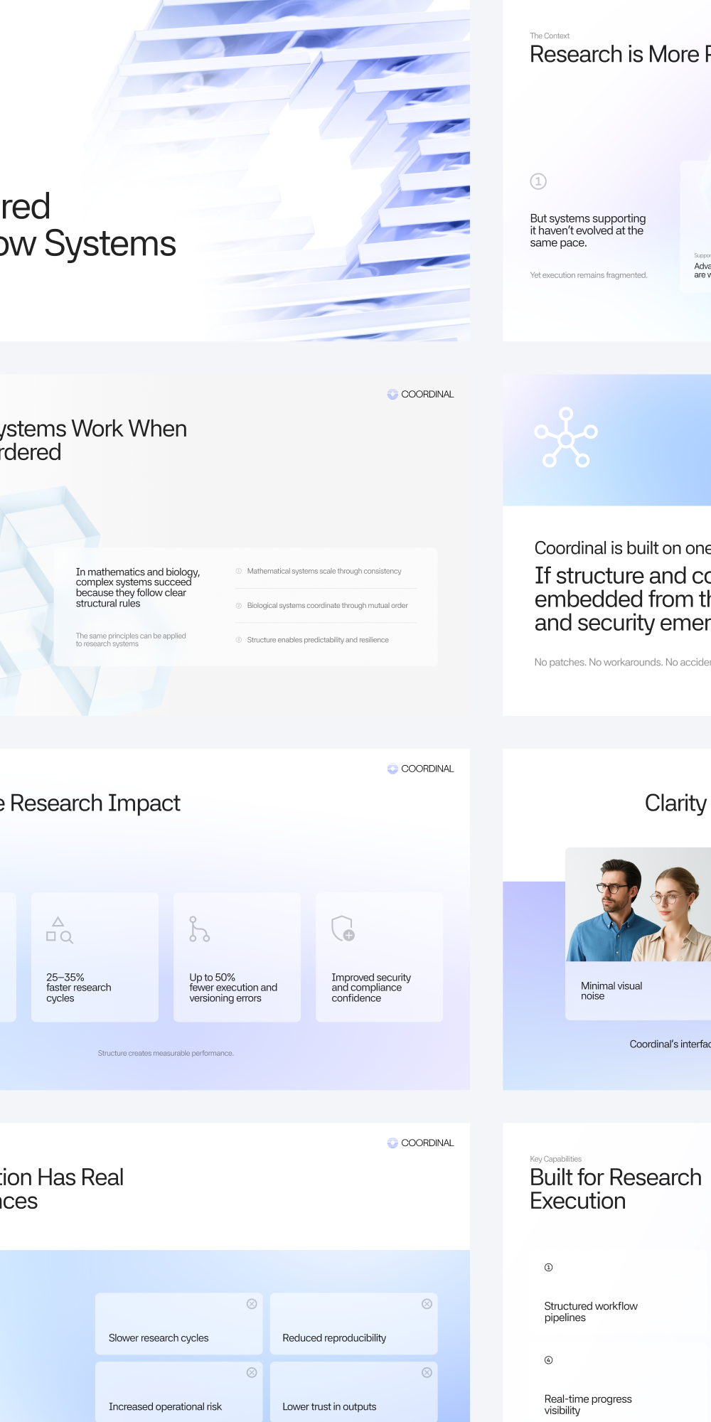 This design utilizes a stark, minimalist aesthetic to present scientific or technological information. The visual language relies on clean lines, high contrast between dark backgrounds and luminous gradients, and abstract forms to evoke a sense of futuristic innovation.