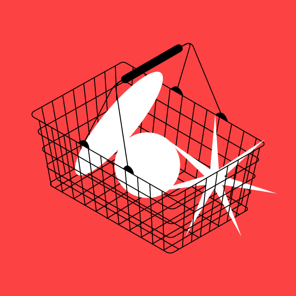The image features a minimalist, graphic representation of several green bottles, likely representing a product or brand, contained within a red shopping basket. The design uses high contrast and simple shapes to convey a direct message related to purchasing or desire.