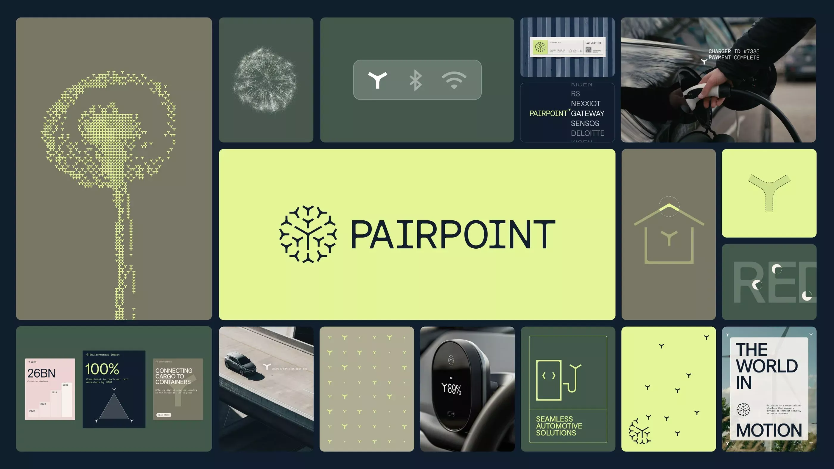 The image presents a clean, modern, and professional grid layout typical of a corporate or technology presentation. It uses muted earth tones contrasted with a bright lime green accent to highlight key information and branding elements.