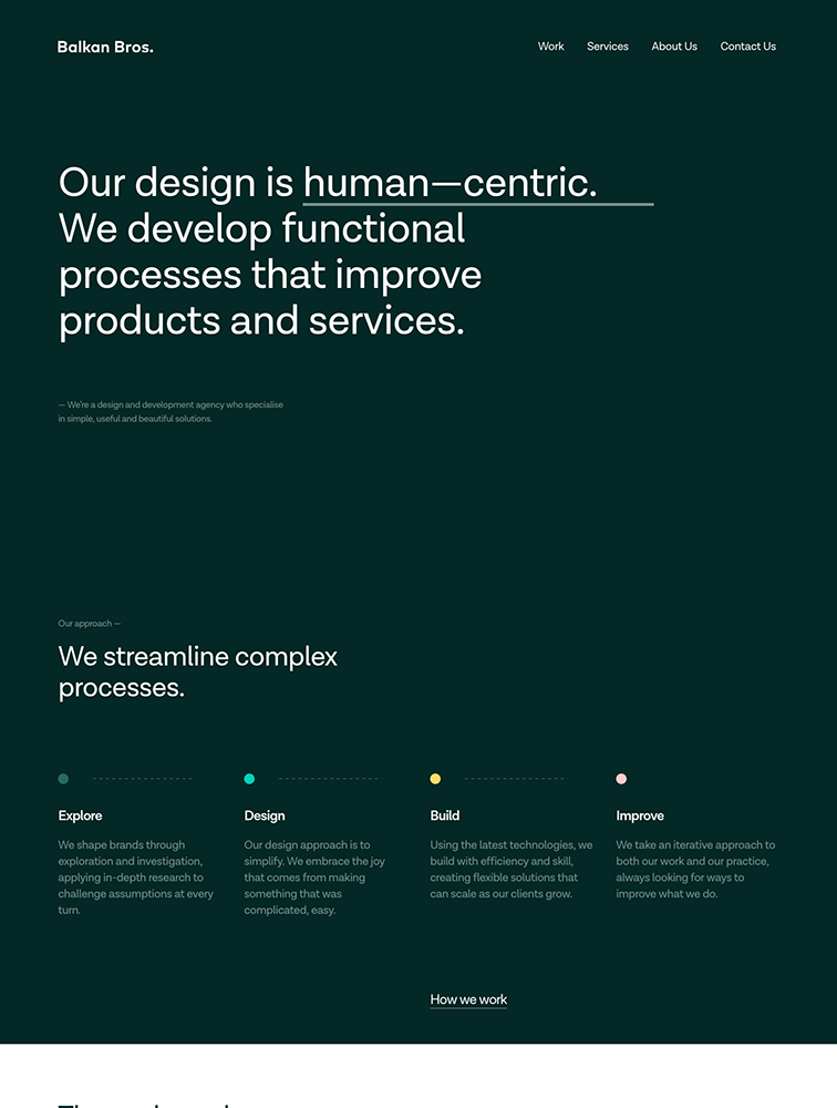 The design is clean, modern, and professional, utilizing a dark color palette to convey sophistication and seriousness. The layout is minimalist, relying on ample negative space to draw attention to the core message and service offerings.