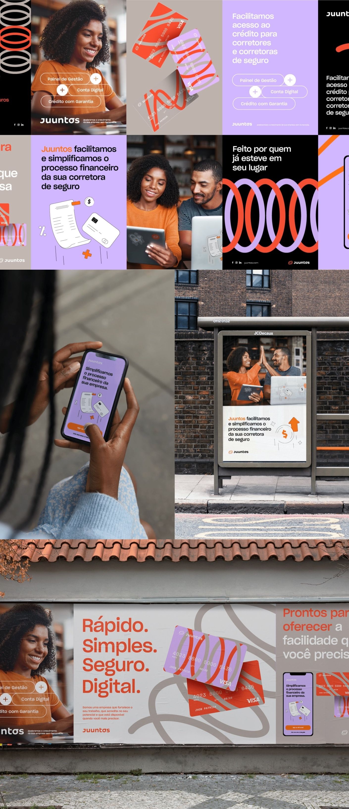 This visual series employs a clean, modern aesthetic characterized by soft gradients and geometric line work to convey trust and ease. The design effectively uses human elements alongside abstract graphics to promote financial services in an accessible manner.