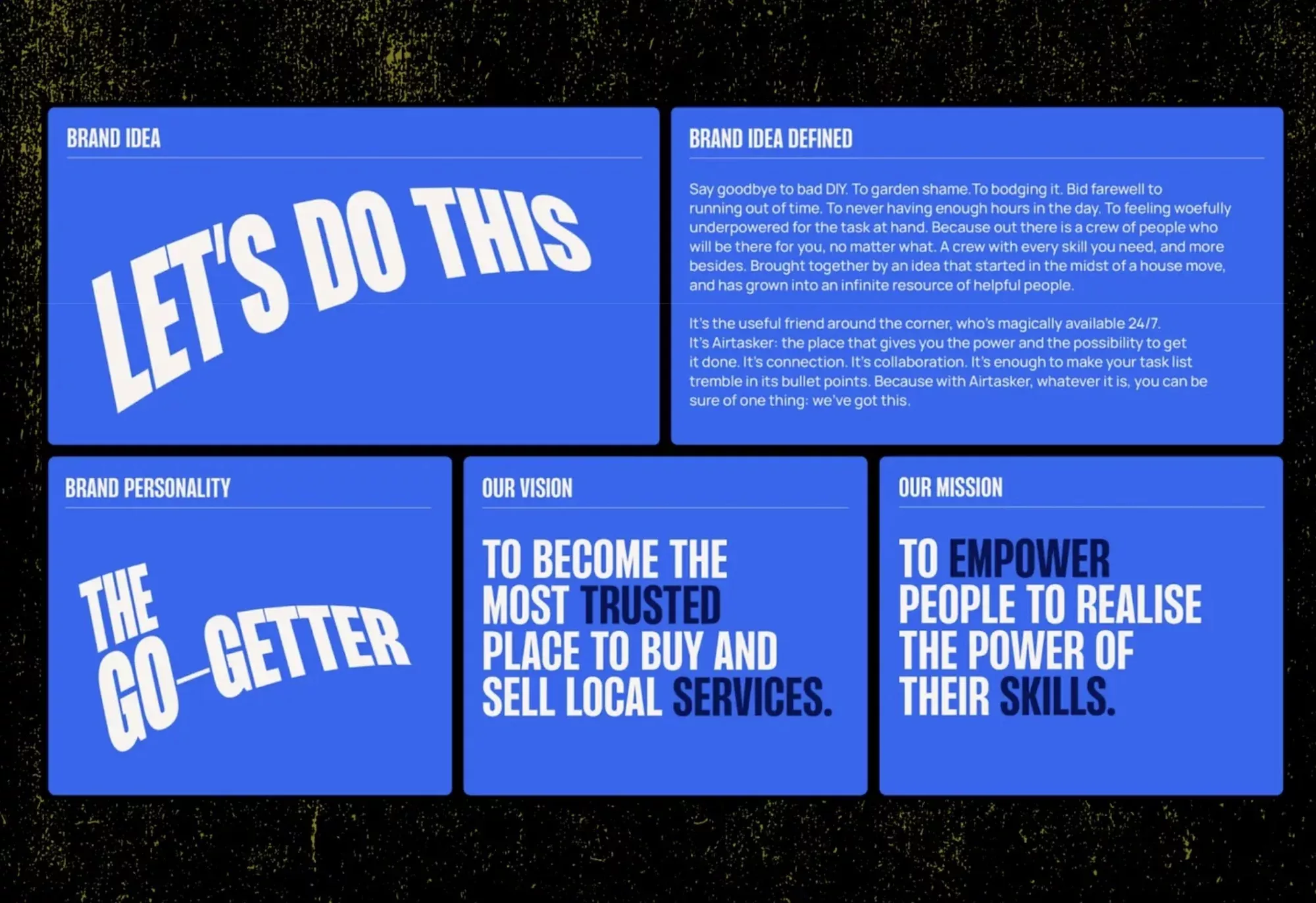 This design utilizes a high-contrast, minimalist approach with bold typography set against deep blue fields on a dark background. The visual language is clean, direct, and authoritative, effectively segmenting different brand concepts into distinct, easily digestible blocks.