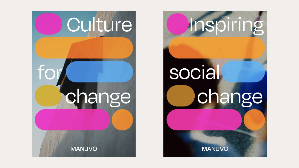 This image presents two vertical graphic designs with a clean, modern, and bold aesthetic, utilizing a limited palette of vibrant pinks, oranges, and deep blues against a muted background. The design effectively uses color blocking and stacked bars to convey concepts related to culture and social change.
