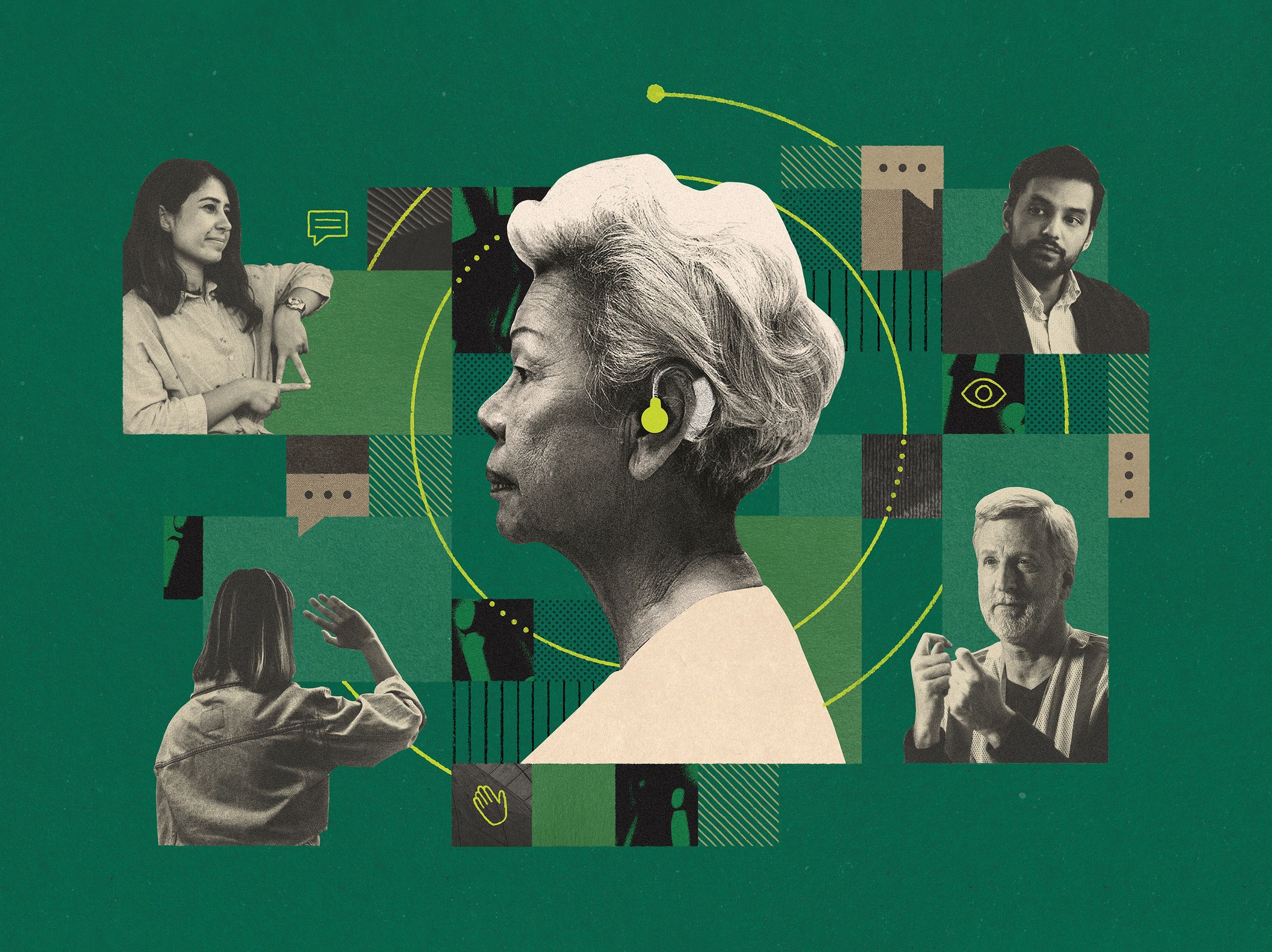 This design employs a modular collage style to present a concept of interconnected individuals or ideas, centering on a large portrait. The visual language is modern yet textured, using muted greens and sharp lines to imply relationships and flow between subjects.