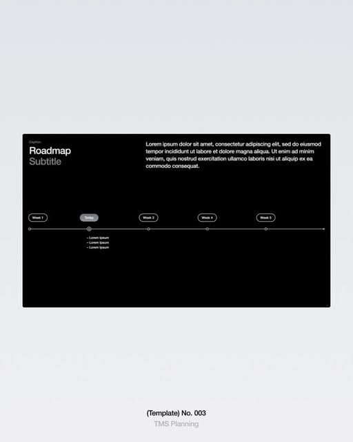 This is a minimalist, dark-themed roadmap presentation utilizing clean lines and ample negative space to convey a structured plan. The design relies heavily on typography and subtle horizontal divisions to organize information clearly.