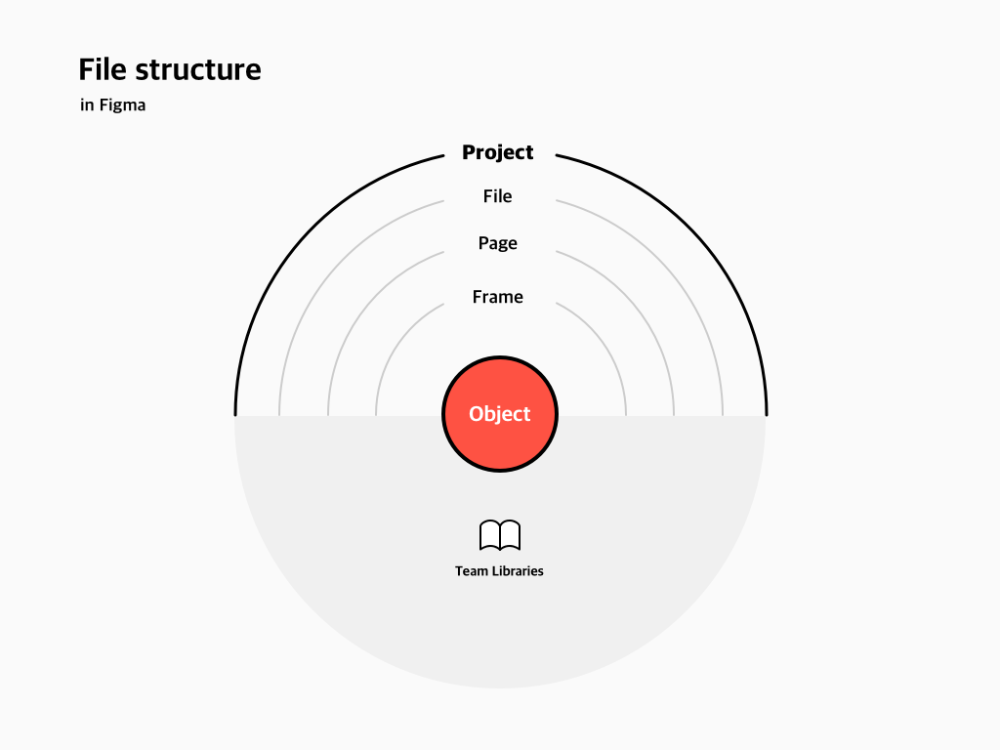 This is a clean, minimalist diagram illustrating a hierarchical file structure within a design tool like Figma. The visual language relies on simple concentric circles and clear labeling to convey complex organizational relationships effectively.