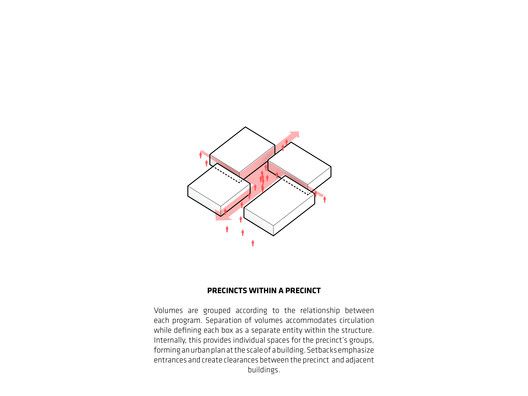 This visual uses simple, clean line art to create an isometric diagram illustrating spatial relationships and layering of conceptual volumes. The design is highly schematic and focuses on clarity, making complex concepts accessible through geometric representation.