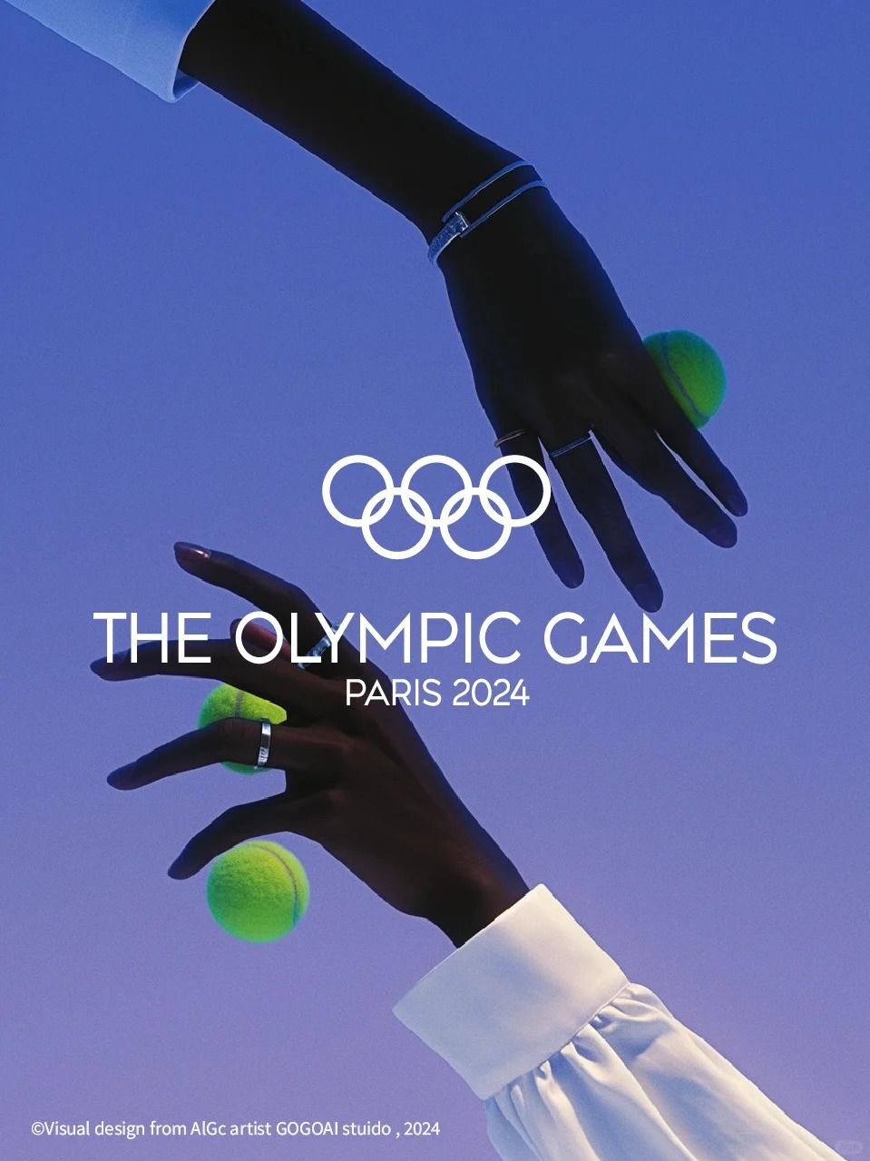 This is a striking, high-contrast promotional design for the Olympic Games, featuring a dark-skinned hand reaching out towards the iconic Olympic rings and a tennis ball. The composition is dynamic, emphasizing movement and connection through the interplay of shadow and light against a vibrant blue background.