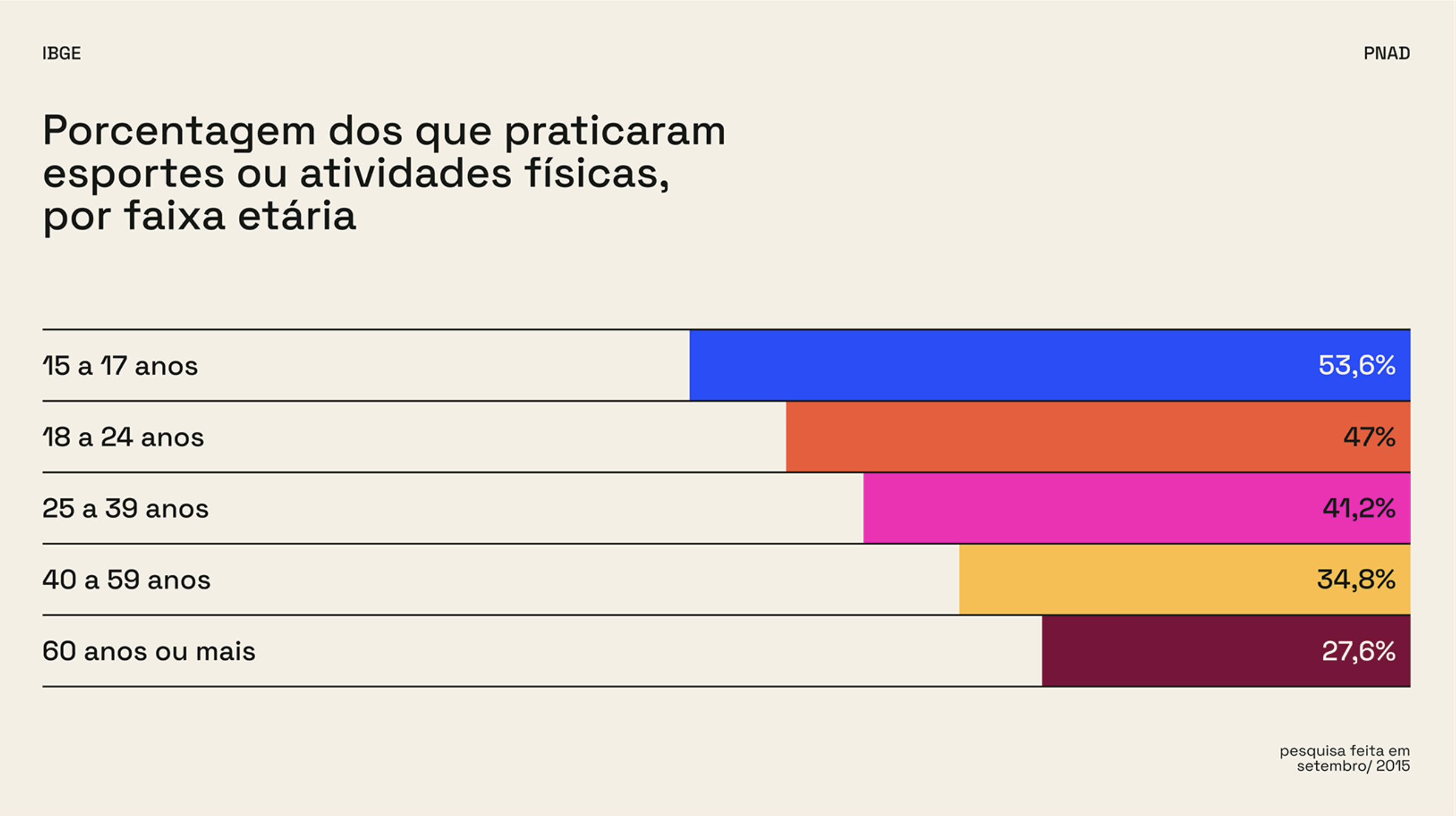 The image is a clear, data-driven bar chart visualization presenting the percentage of people who practice sports or physical activities categorized by age group. The design is clean, minimalist, and highly functional, prioritizing readability of the statistical information.