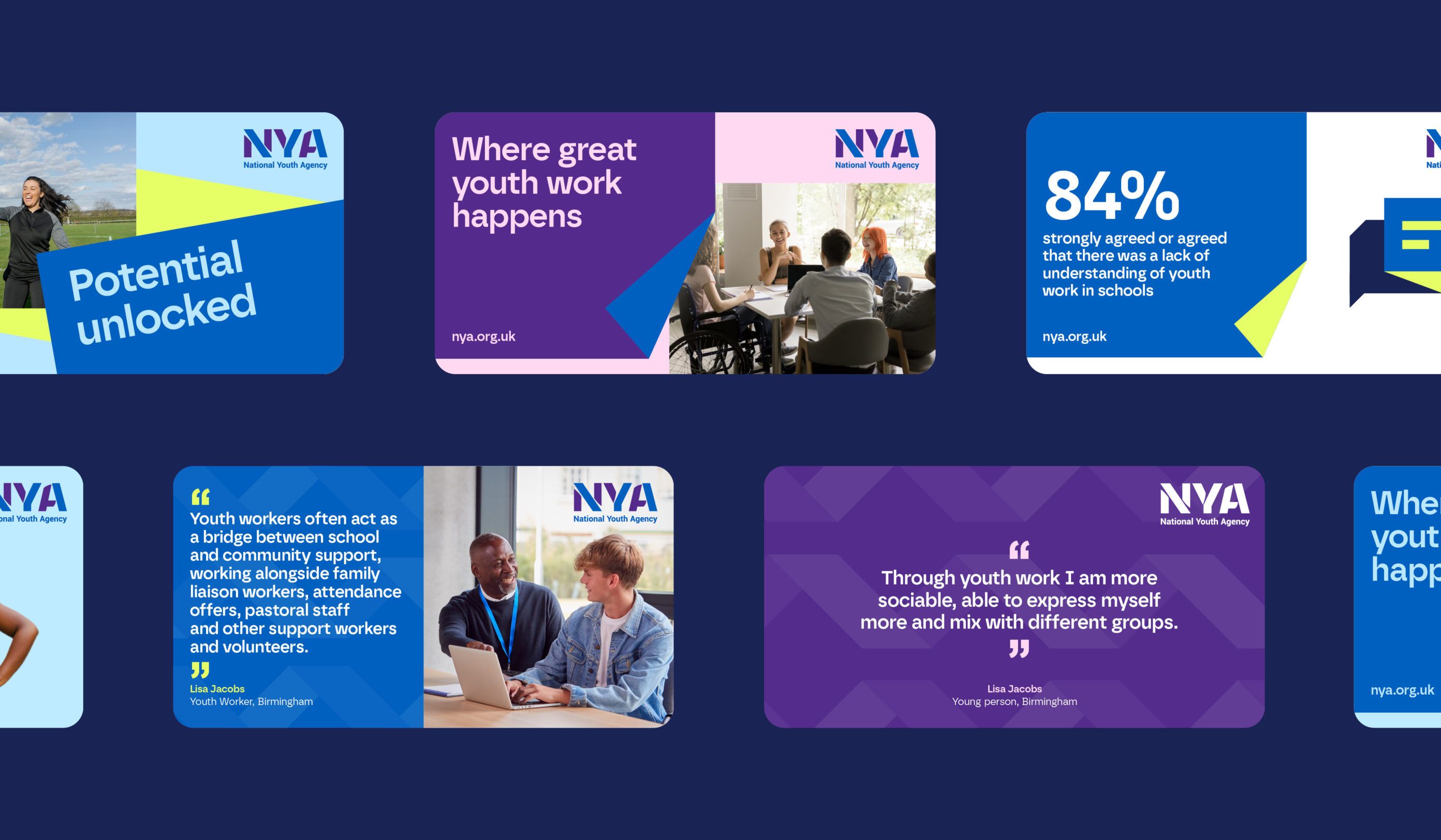 This design utilizes a clean, modern aesthetic characterized by strong color blocking and high contrast against a dark background. The visual language is professional and data-driven, employing distinct modular cards to present statistics and testimonials clearly. The overall feel is trustworthy, organized, and contemporary.