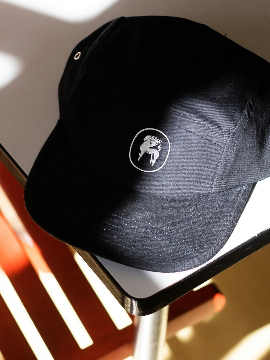 This is a close-up shot of a black baseball cap featuring a subtle, circular logo embroidered or printed on the front panel. The design is minimalist and focuses on a single graphic element against a dark background, suggesting a casual yet branded aesthetic.