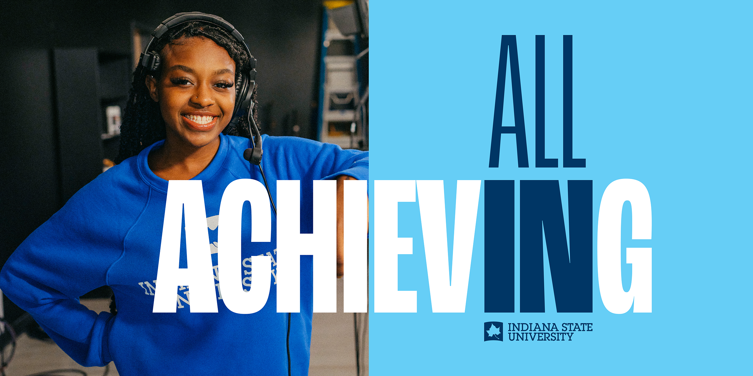 This is a promotional graphic featuring a smiling young woman against a bright blue background, overlaid with large white text proclaiming 'ALL ACHIEVING' in a bold, modern typeface. The design is clean, high-contrast, and professional, aiming for an inspirational and academic feel.