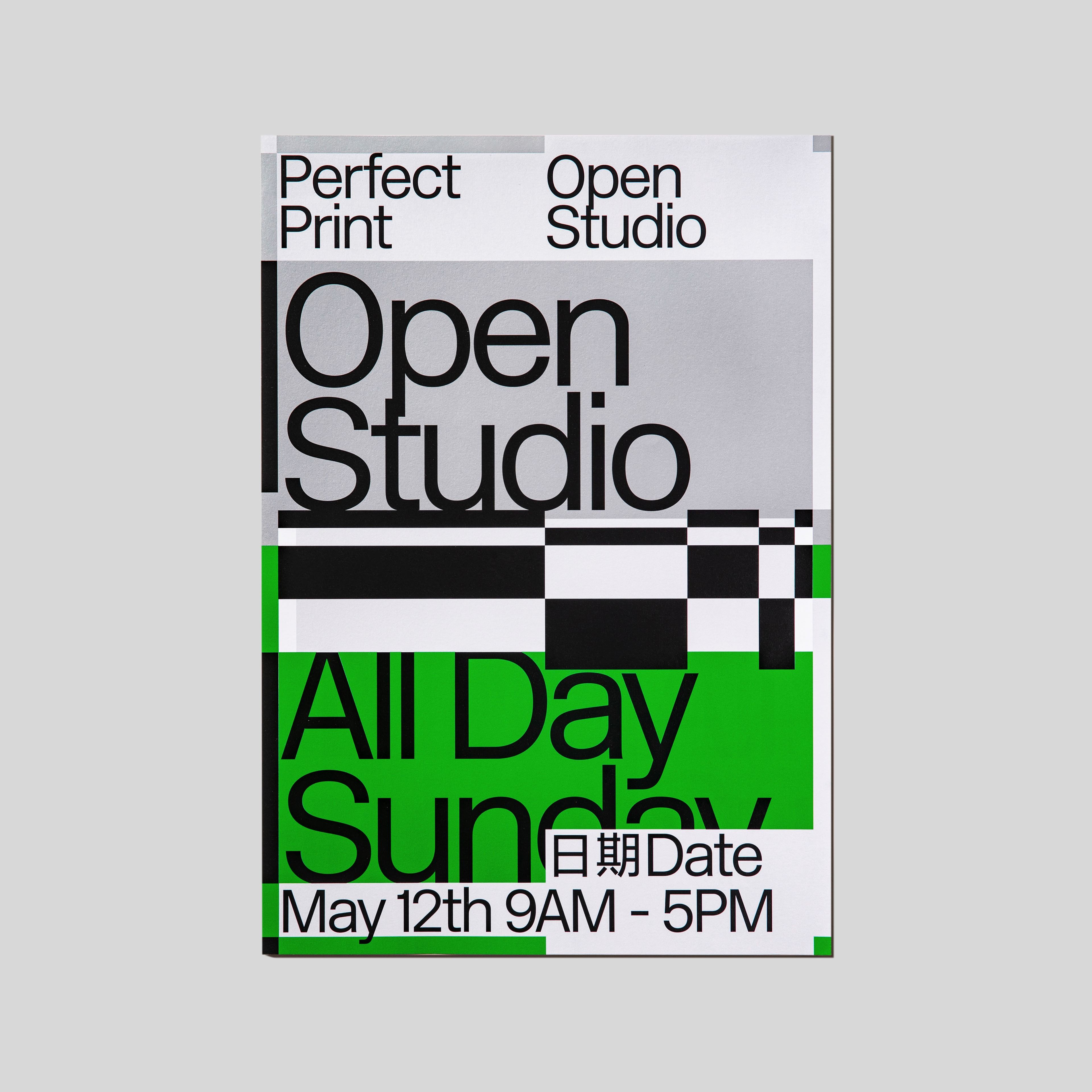 This design utilizes a stark, high-contrast visual language dominated by black, white, and vibrant green accents. The composition is highly structured, employing geometric patterns like the checkerboard to create visual interest and clearly delineate information hierarchy. The overall feel is modern, clean, and energetic.