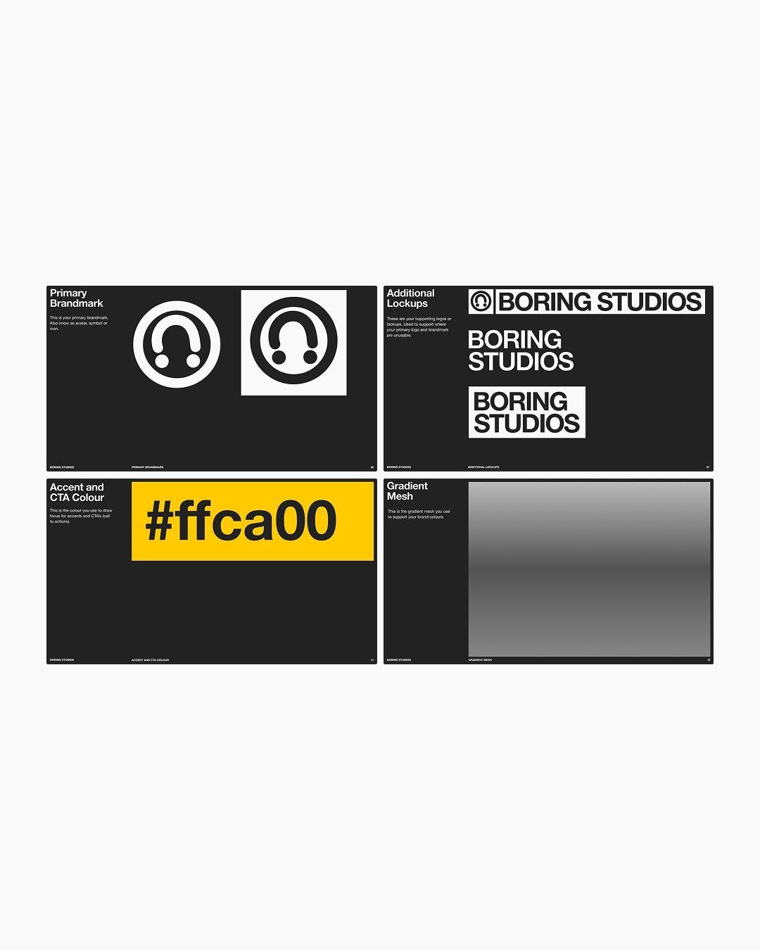 This design utilizes a stark, high-contrast visual language dominated by monochrome shades and a single vibrant accent color. The presentation is clean, structured, and professional, conveying a serious and contemporary corporate aesthetic.