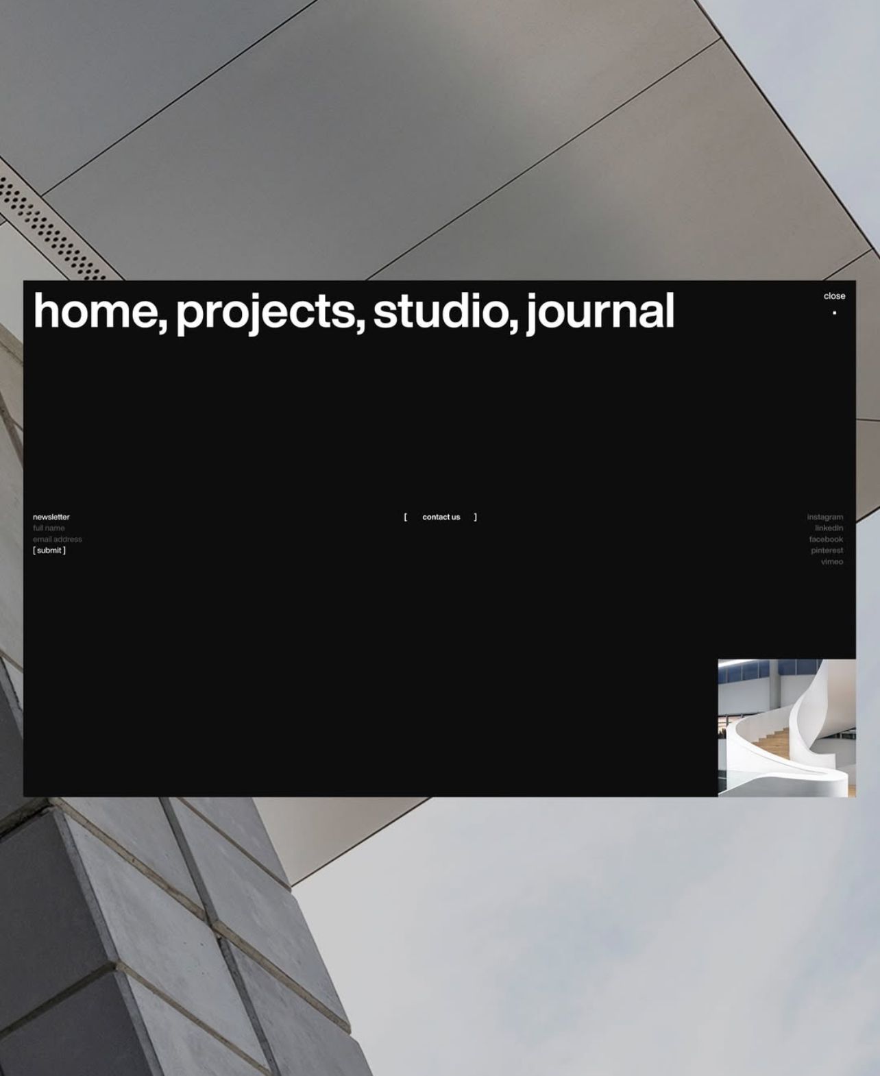 The image presents a minimalist, dark-themed interface or landing page with clean typography set against an architectural background. The design emphasizes negative space and a sophisticated, professional aesthetic suitable for creative portfolios or studio sites.
