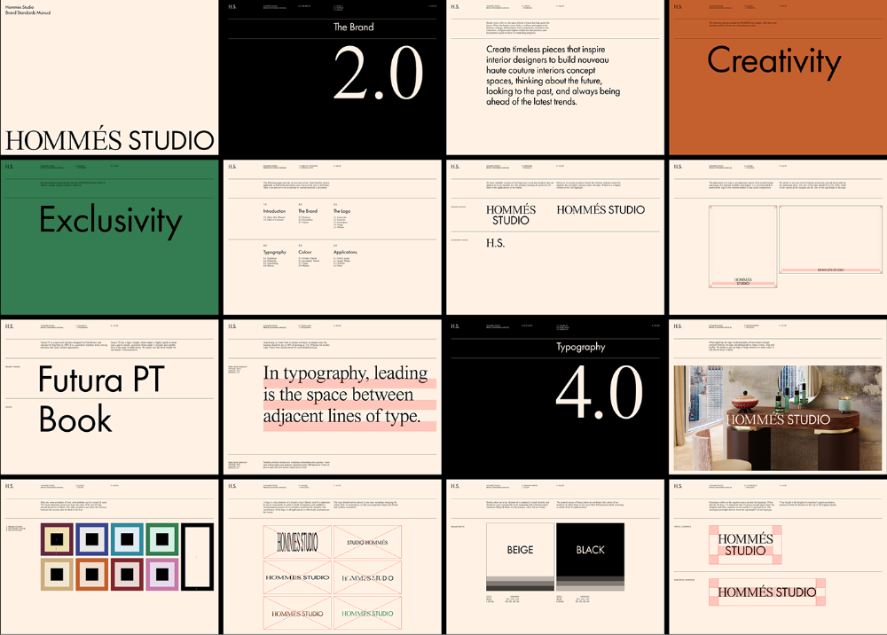 This visual presentation showcases a cohesive and professional design portfolio, emphasizing clean layouts, strong typography, and sophisticated branding. The work balances minimalist aesthetics with structured information display, positioning the studio as a creative and established entity.