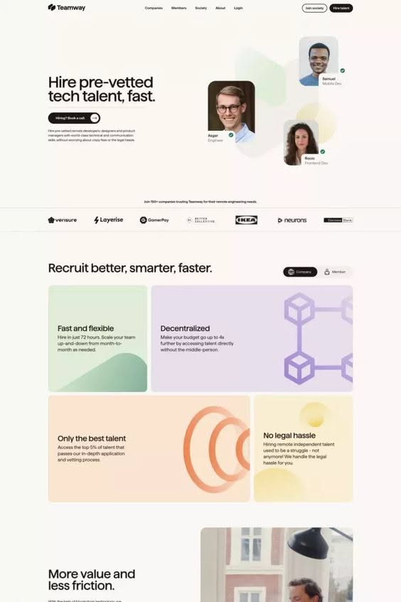 The image is a clean, professional webpage section designed to promote the benefits of hiring tech talent on Teamway. It uses a minimalist layout with clear text and photographic elements to convey trust and efficiency.
