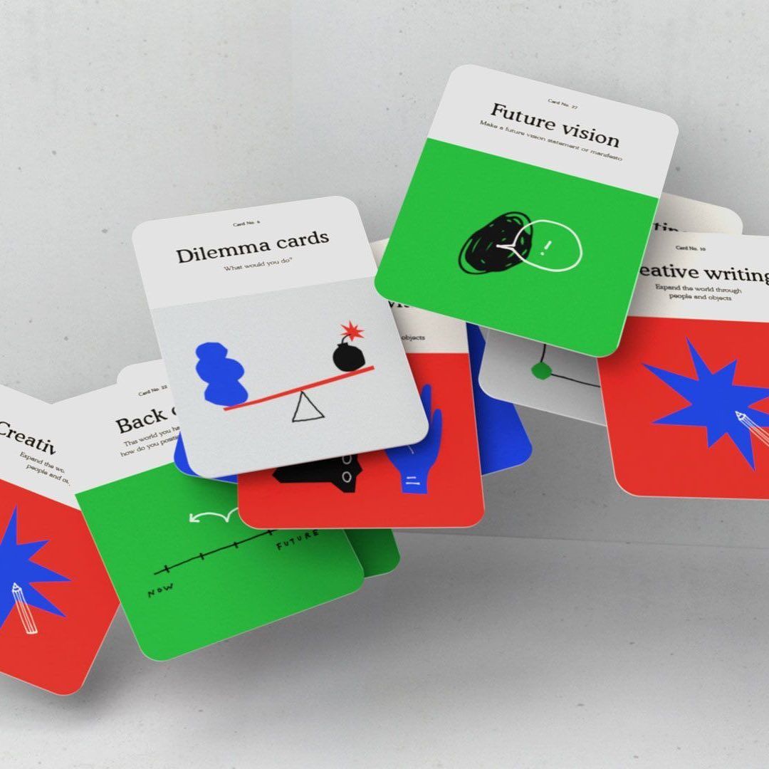 This is a collection of conceptual cards featuring striking geometric and symbolic designs against solid, vibrant color fields. The visual language is clean and modern, using high contrast to evoke themes of future vision, dilemmas, and creative thought. The overall feel is professional yet deeply reflective and imaginative.