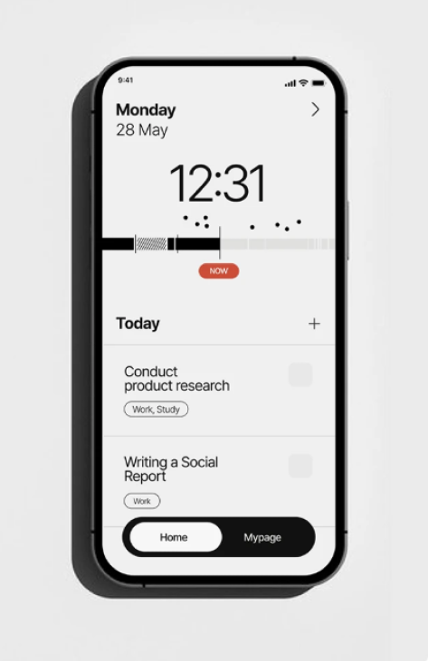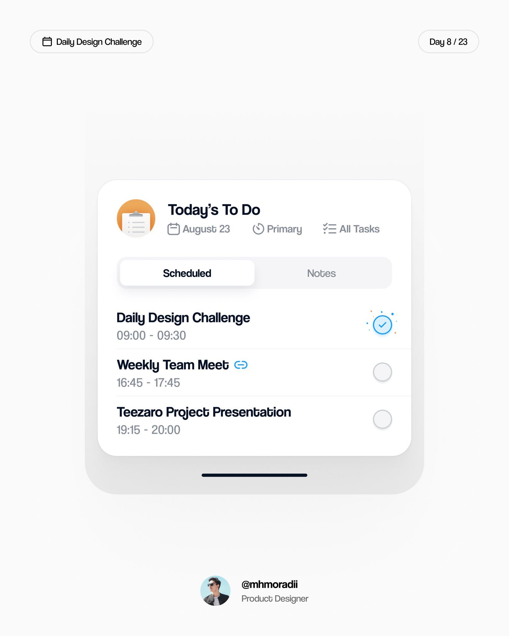 The image presents a clean, minimalist user interface for a daily task management application. It utilizes ample white space and subtle gray tones to create a professional, organized, and modern feel. The design prioritizes readability and clear delineation of scheduled items.