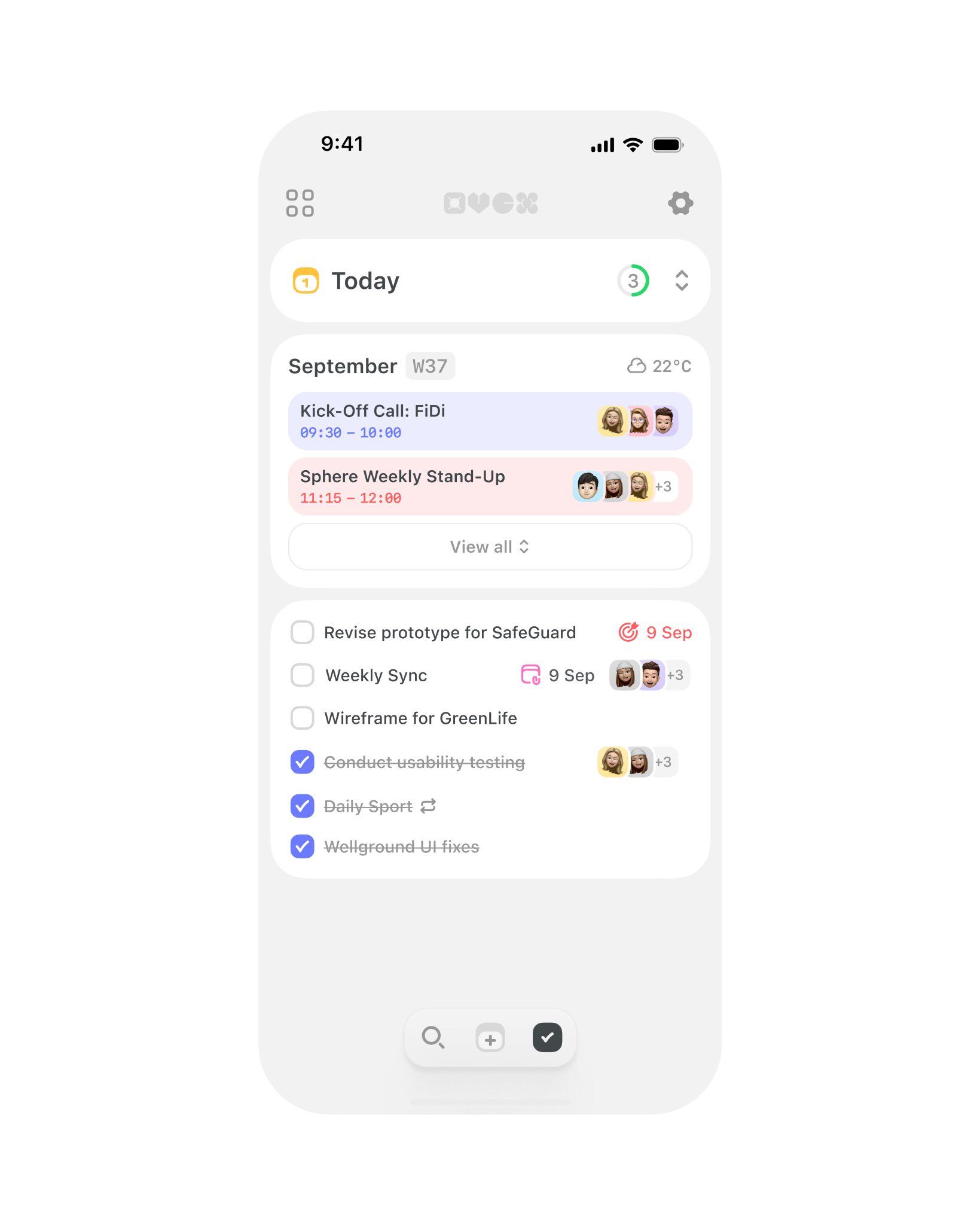 The interface presents a clean, modern, and highly functional design typical of productivity or task management applications. It utilizes ample white space and clear iconography to organize daily tasks effectively, conveying a sense of order and professionalism.