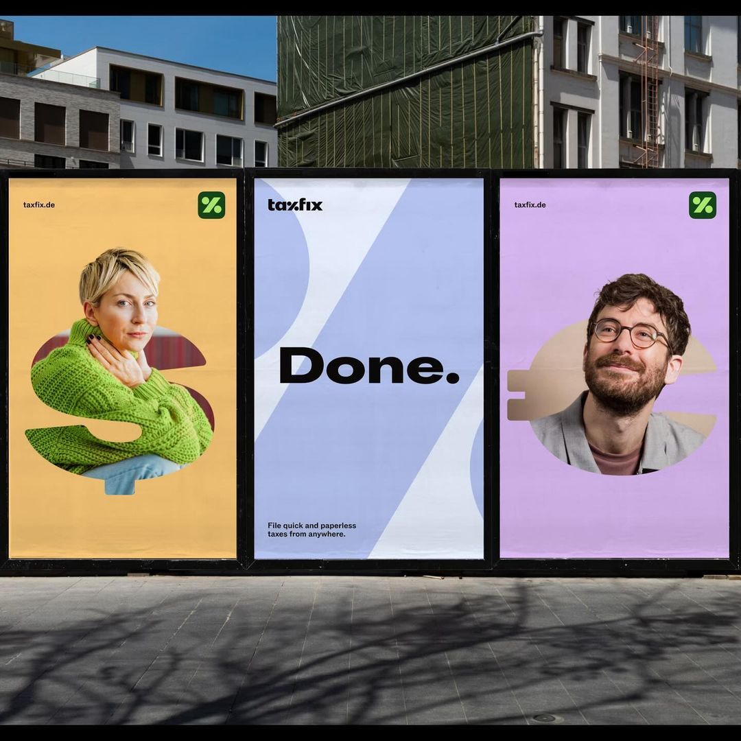 The image presents a clean, modern, and professional visual identity for a service called 'taxfix', utilizing strong graphic elements and high-quality photography. The design balances organic, warm tones with cool, minimalist backgrounds to convey trust and efficiency.