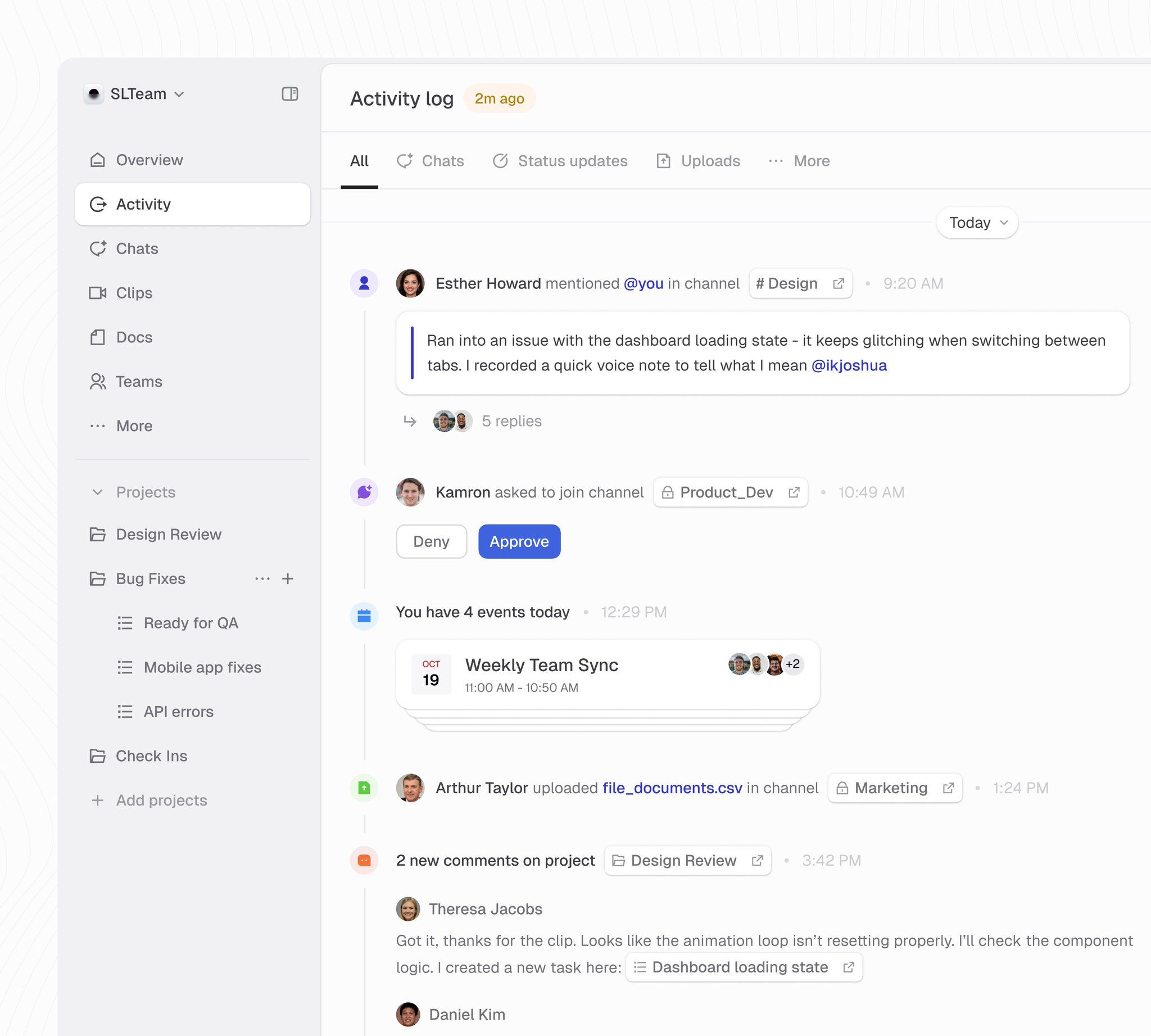 The image displays a clean, functional user interface for an activity log within a software platform. The design is minimalist, relying on clear hierarchy and standard web conventions to present chronological data effectively.