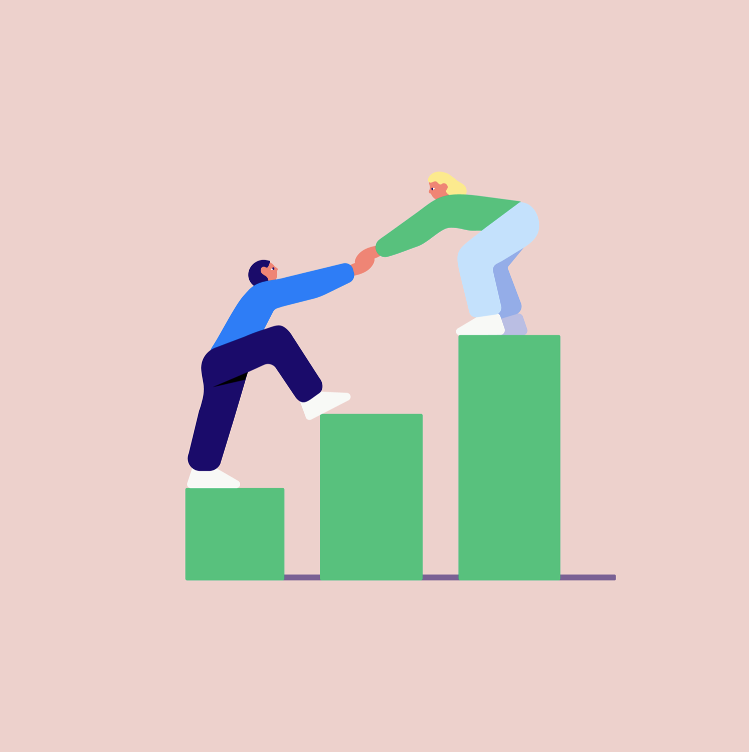 This illustration utilizes a clean, flat design aesthetic to depict a collaborative effort or partnership. The visual language is minimalist and friendly, employing soft colors and simple geometric shapes to convey concepts like teamwork and achievement. The composition focuses on the interaction between figures positioned against a subtle background.