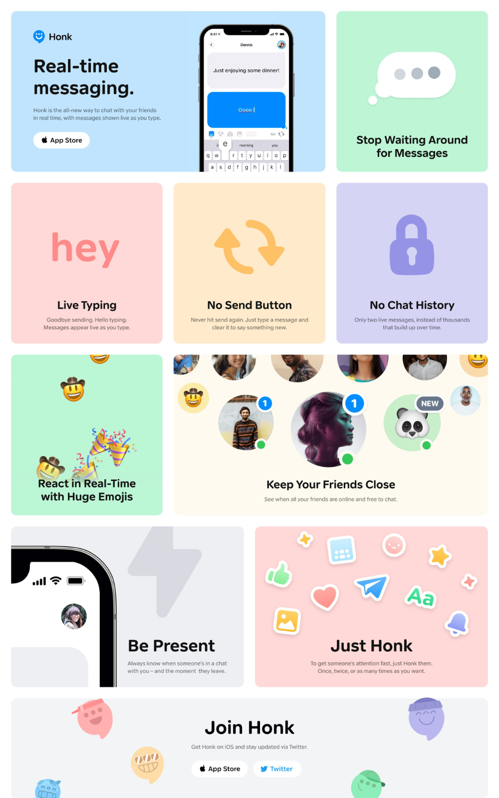 A vibrant mobile app marketing landing page showcasing a messaging platform called Honk with a playful, modern aesthetic. The design uses a grid-based layout with colorful feature cards, soft pastel backgrounds, and friendly illustrations to communicate key app functionalities. The overall visual language is contemporary, approachable, and designed to appeal to a younger demographic.