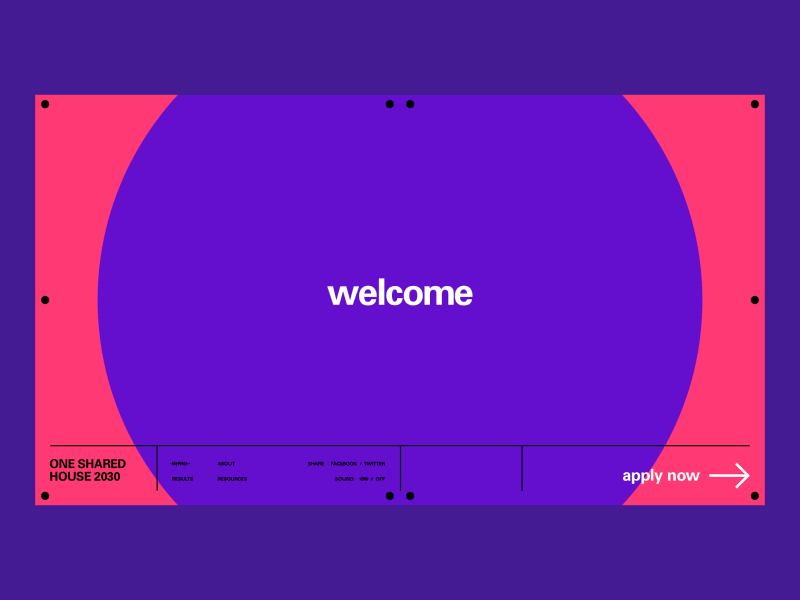 A bold, modern digital interface featuring vibrant neon colors and geometric shapes. The design employs a striking contrast between hot pink and deep purple with a minimalist approach, centered around a welcoming call-to-action. The composition suggests a contemporary web or app landing page with a playful yet professional aesthetic.