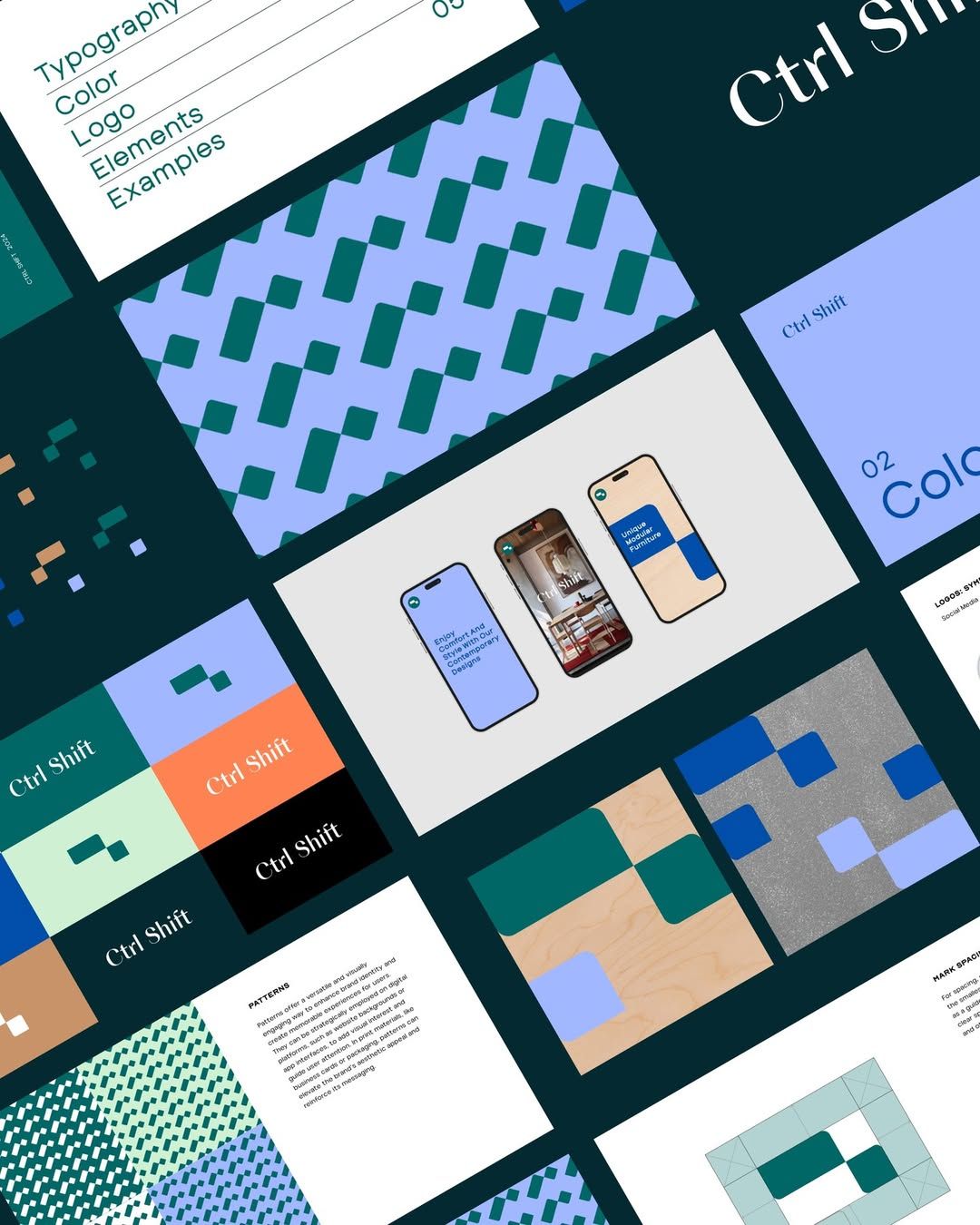 This image displays a modern, clean, and structured UI design template or mockup, characterized by geometric patterns and a muted, sophisticated color palette. The layout is modular, featuring various elements like buttons, cards, and background textures arranged in a grid-like fashion.