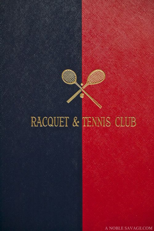 A classic, heritage-inspired design featuring a bold vertical color split between deep navy and crimson red, with centered gold crossed racquet iconography. The composition evokes traditional club branding with a refined, timeless aesthetic that emphasizes prestige and sporting tradition.