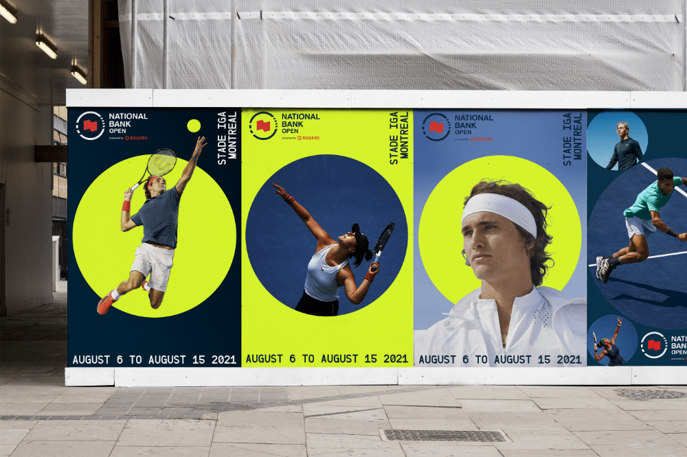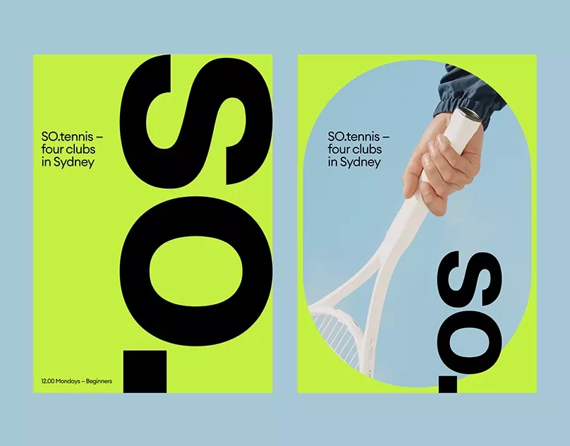 This is a dynamic and energetic graphic featuring a tennis player in motion, overlaid with bold, blocky text and a vibrant, curving neon-green ring. The design successfully conveys action, sport, and modern athleticism through high contrast and strong graphic elements.