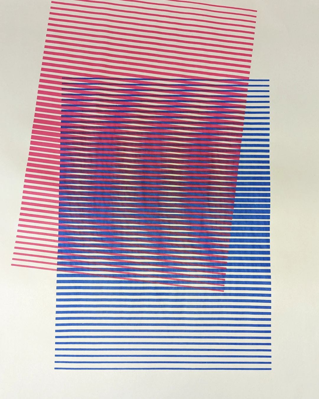 This image presents a strong graphic composition built entirely from horizontal lines of varying saturation and color, creating a dynamic texture. The design relies on the interplay between stripes of pink/red and deep blue, resulting in a modern, striped pattern.