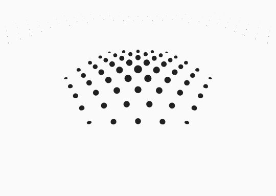 This is a minimalist abstract design composed entirely of uniformly sized black dots arranged in a roughly elliptical or cloud-like shape. The visual language is stark, precise, and relies on negative space to define the form, creating a sense of texture or density.