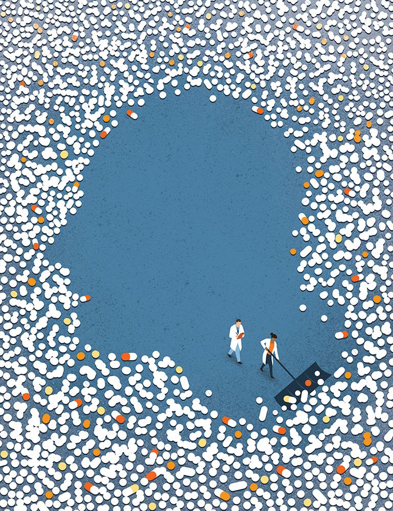 This image features a stark, minimalist composition where a dark blue void is framed by a dense field of white and orange granular elements. The design evokes themes of emptiness, focus, and the boundary between the known and unknown.