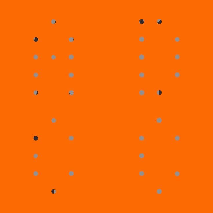 The image features a minimalist, abstract composition dominated by a vibrant orange background punctuated by small, scattered dark and light dots arranged in vertical patterns. The design relies heavily on negative space and subtle textural variation through the placement of these simple marks.