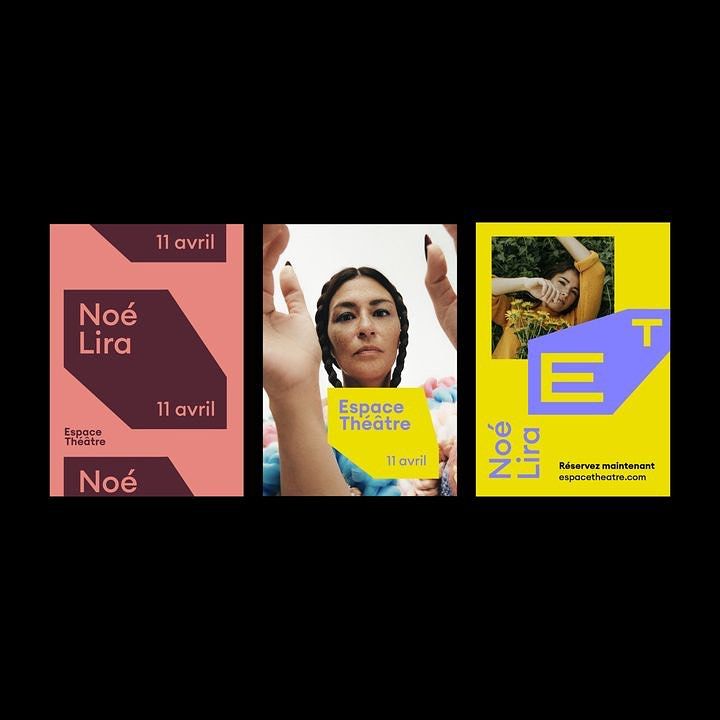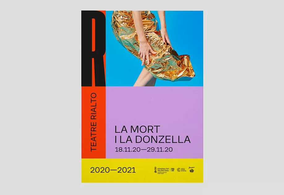 The image displays promotional posters for a theatrical production, characterized by a clean, modern, and somewhat minimalist design. The use of strong typography against muted background tones creates a sophisticated and direct visual hierarchy, typical of contemporary arts promotion.