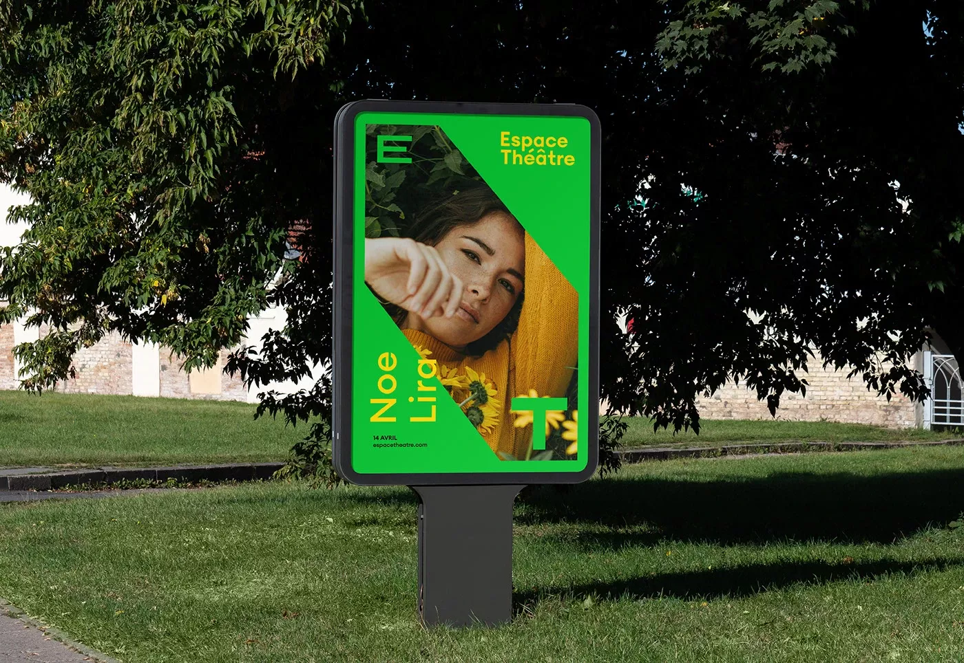 A vibrant contemporary poster for Space Theatre featuring bold neon green typography and a striking portrait of a person against a saturated color-blocked background. The design employs a modern, minimalist approach with high contrast and playful geometric composition that commands attention in outdoor settings.