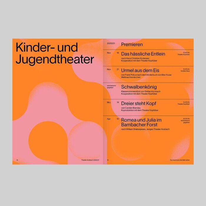 The design is clean, modern, and uses a soft, warm color palette dominated by coral and pale pink/peach tones. It employs large, organic shapes to create a gentle, inviting visual hierarchy for the listed theatrical performances.