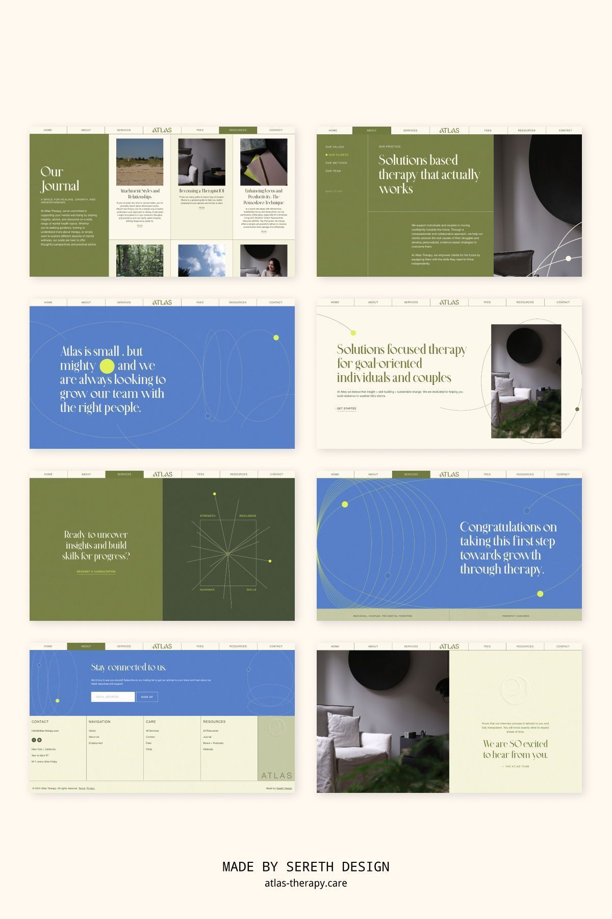 The design exhibits a clean, modern, and professional aesthetic characterized by ample white space and a restrained, nature-inspired color palette. The layout is modular and grid-based, suggesting a focus on clarity and organized information delivery.