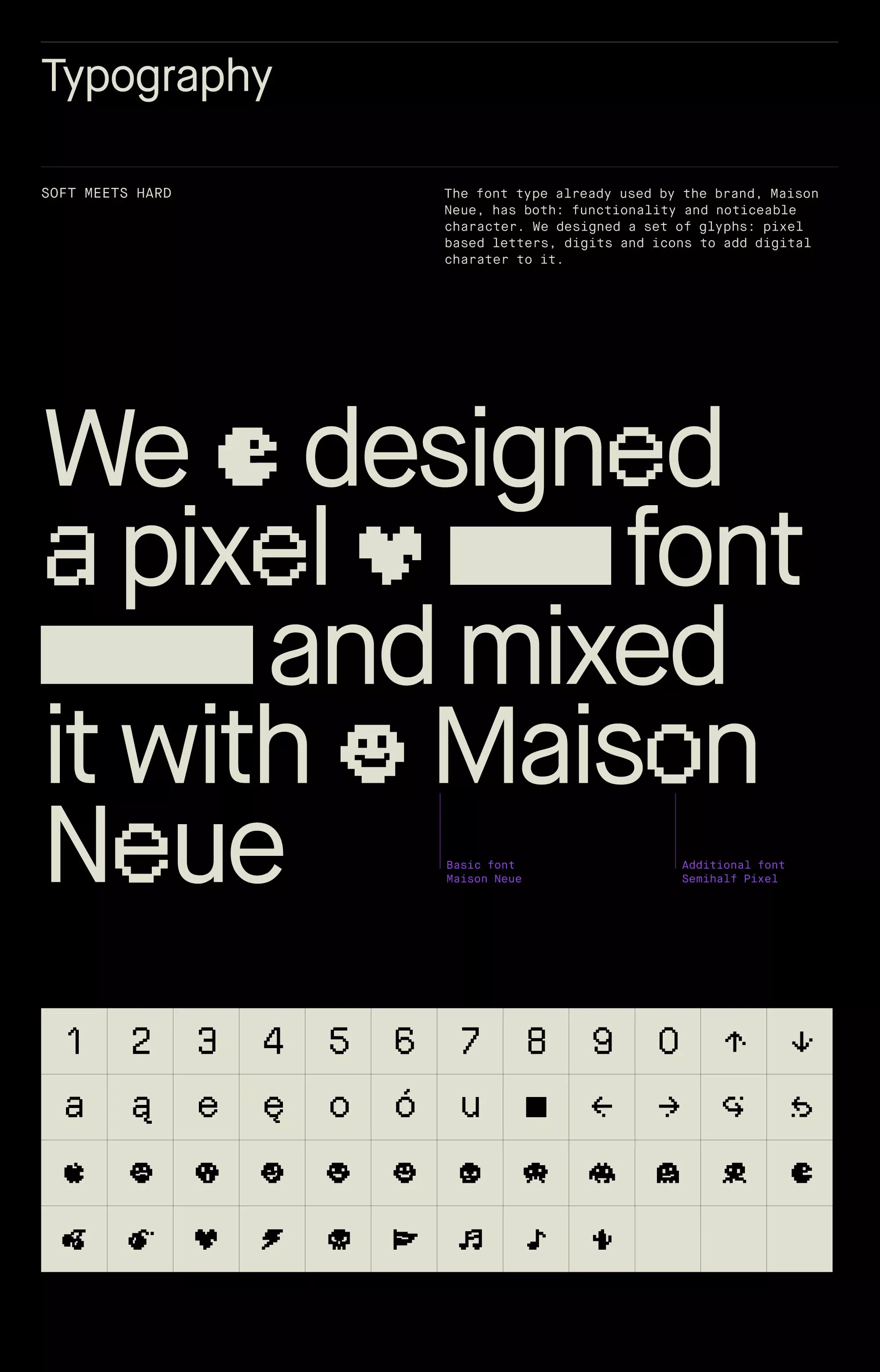 This design showcases a clean, high-contrast typographic exploration, blending modern sans-serif elements with pixelated glyphs. The visual language is technical and precise, utilizing stark black and white to emphasize form and experimentation. The overall feel is minimalist yet deeply focused on digital and retro design concepts.