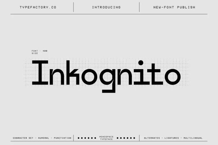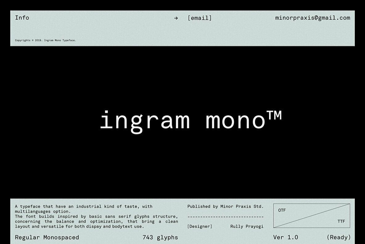 This design is a highly minimalist and typographic showcase, utilizing stark black and white contrast to emphasize the font display. The visual language is clean, technical, and focused entirely on presenting information about a specific typeface.