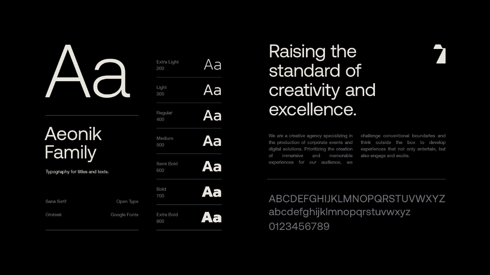 This slide demonstrates clear, high-contrast typography against a clean color palette, effectively highlighting the characteristics of a specific font style. The design is minimalist and highly functional, emphasizing readability and typographic excellence.