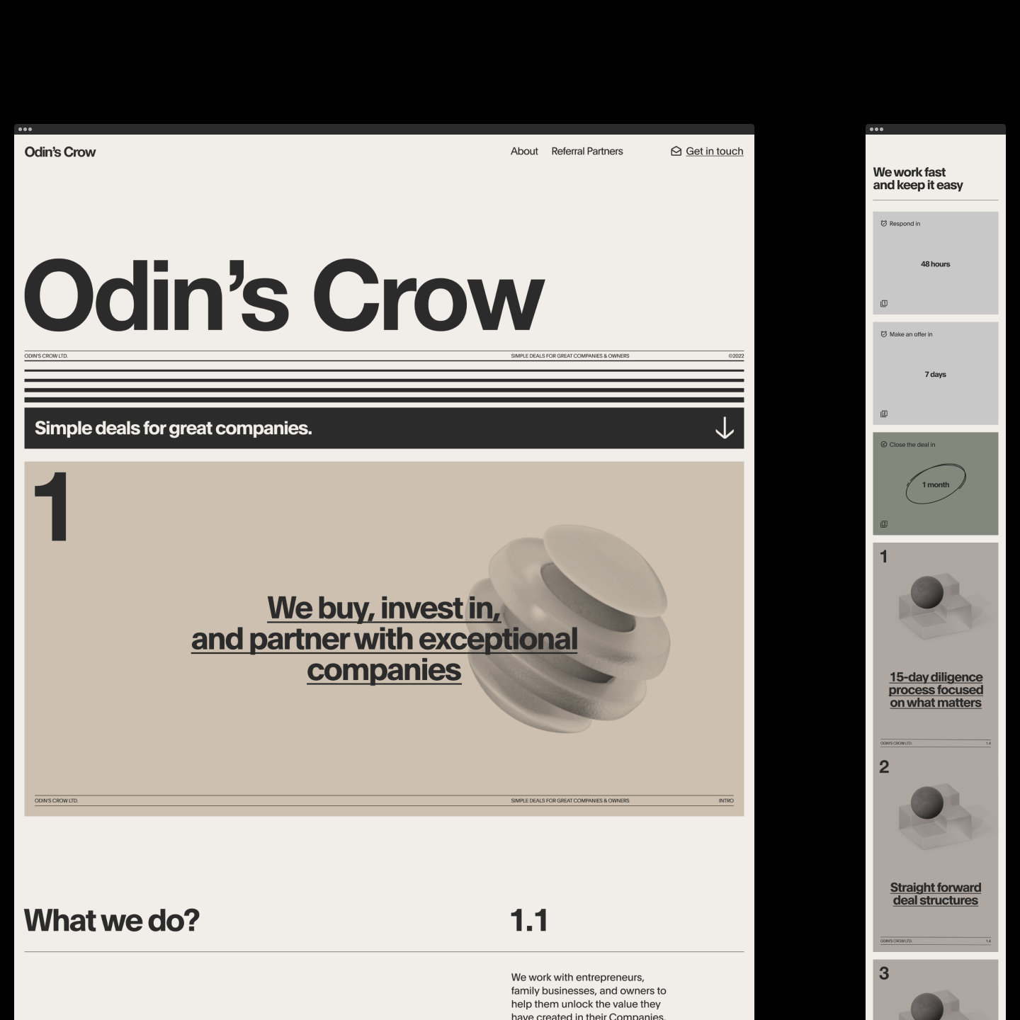 A minimalist corporate website for Odin's Crow, a venture capital or investment firm, featuring clean typography, ample whitespace, and a sophisticated neutral palette. The design employs a modern, editorial approach with geometric 3D elements and a structured grid layout that conveys professionalism and clarity.