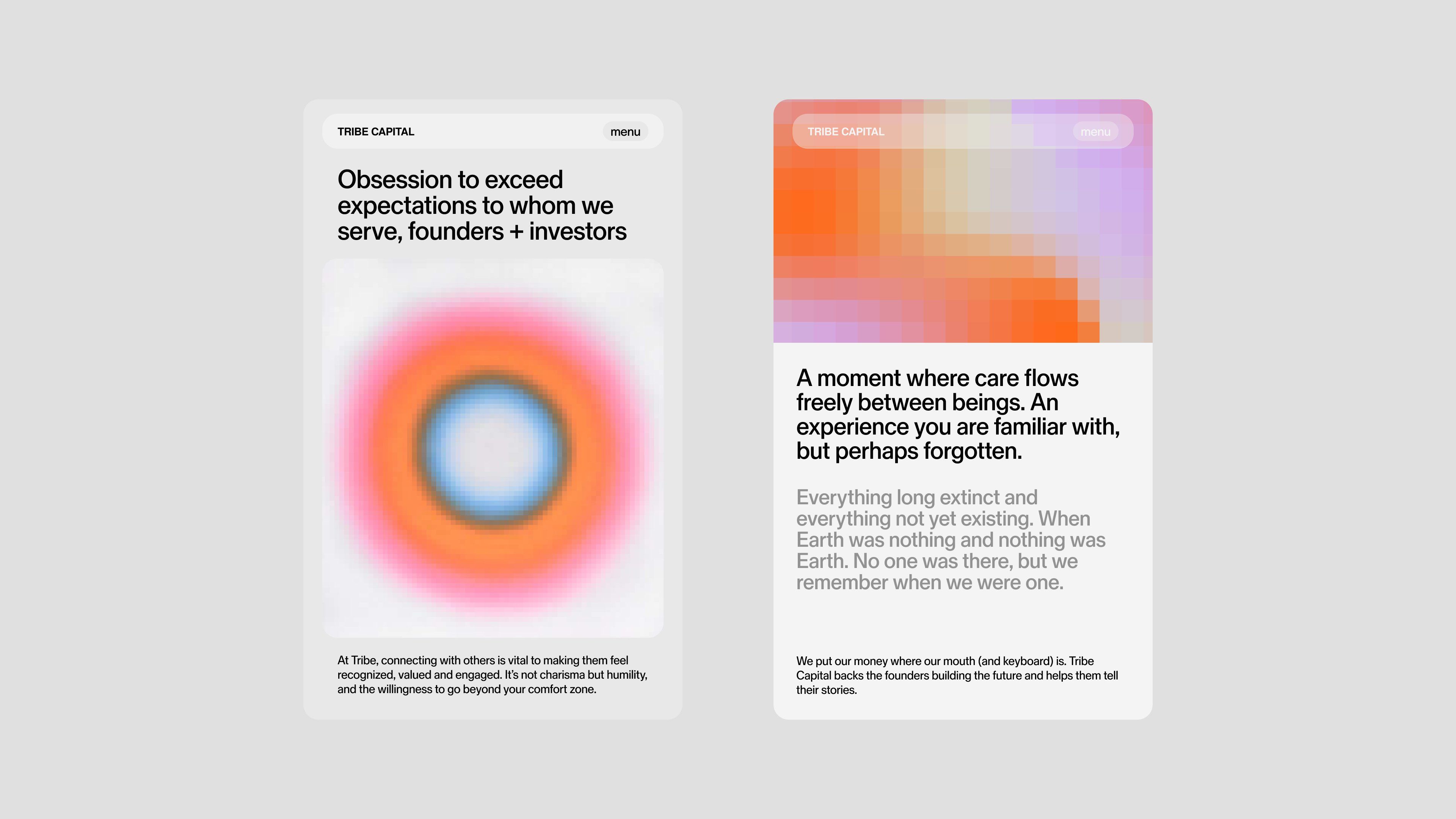 The image displays two distinct, minimalist digital cards or screens, likely representing a portfolio or profile view. The design utilizes soft gradients and ample white space to convey a modern, empathetic, and sophisticated feel.
