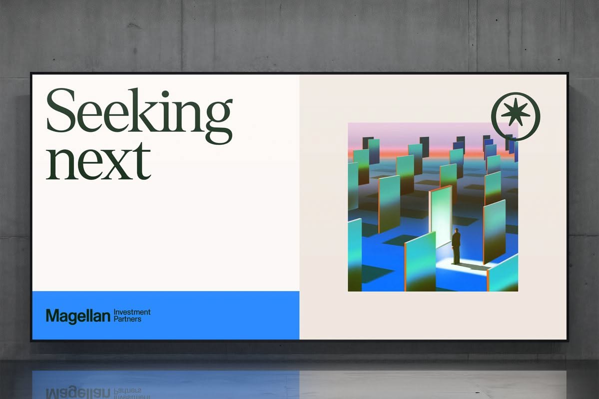 This design employs a clean, modern aesthetic suitable for corporate branding, using ample negative space to highlight key text and an abstract visual element. The visual language is crisp and professional, effectively conveying a sense of forward-thinking ambition.