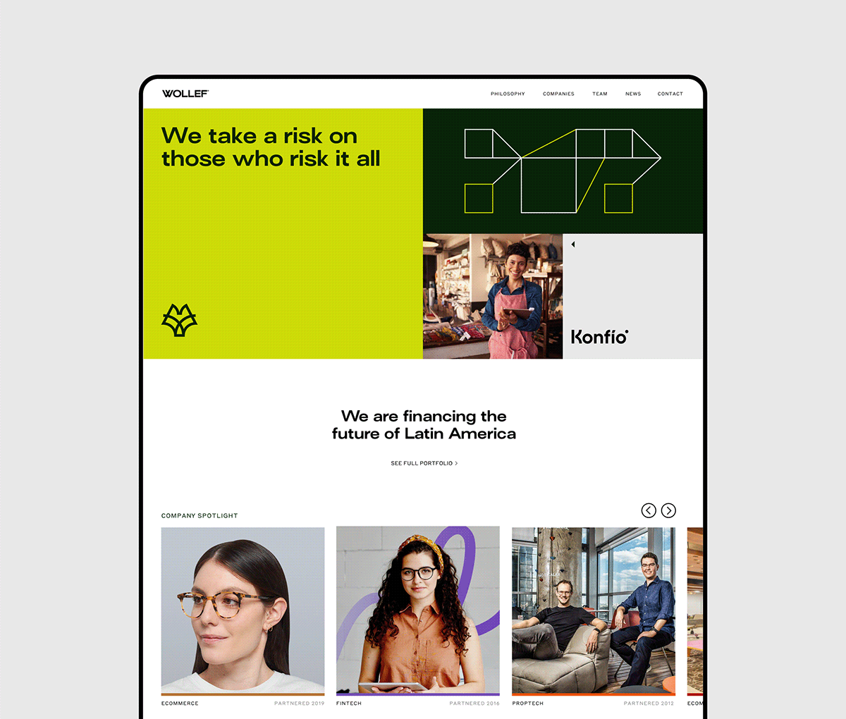 The design employs a clean, modern aesthetic with ample white space and a muted, professional color palette. It uses geometric shapes and simple iconography to convey trust and innovation in the investment sector.