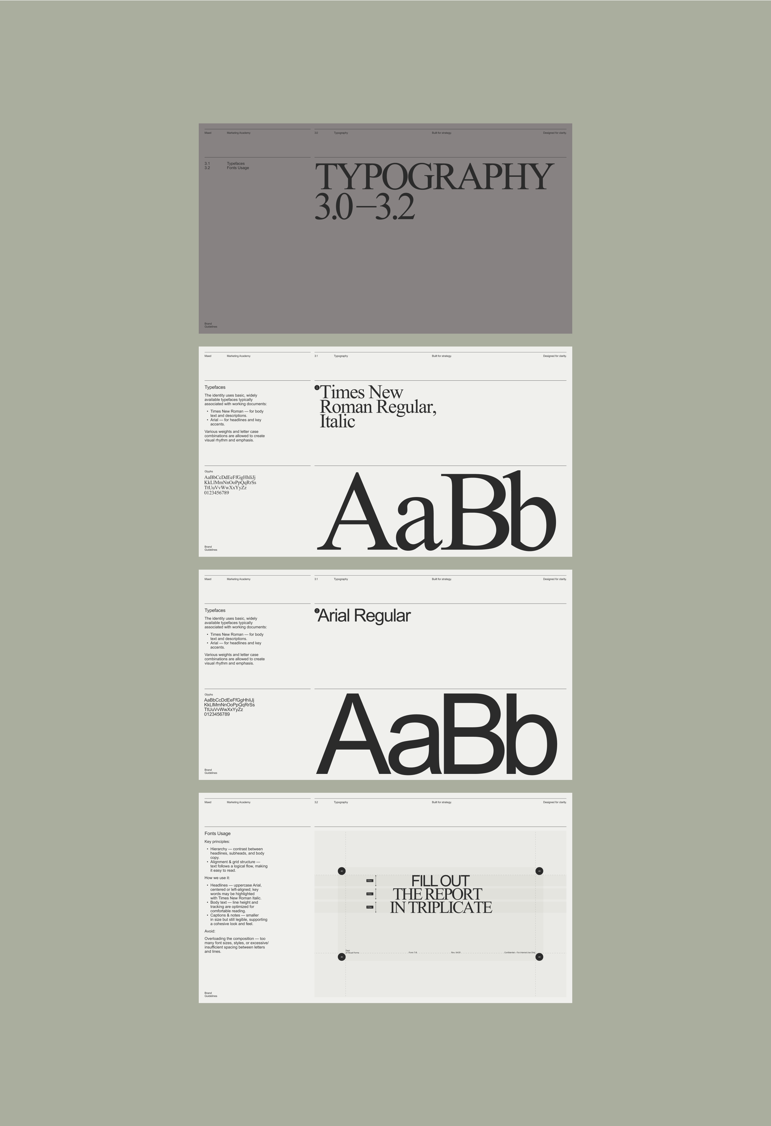 This design showcases a highly structured, minimalist exploration of typefaces, presenting typographic samples with academic precision. The visual language is clean and restrained, relying heavily on negative space to draw attention directly to the textual examples. The overall feel is highly professional, analytical, and focused purely on the study of typography.